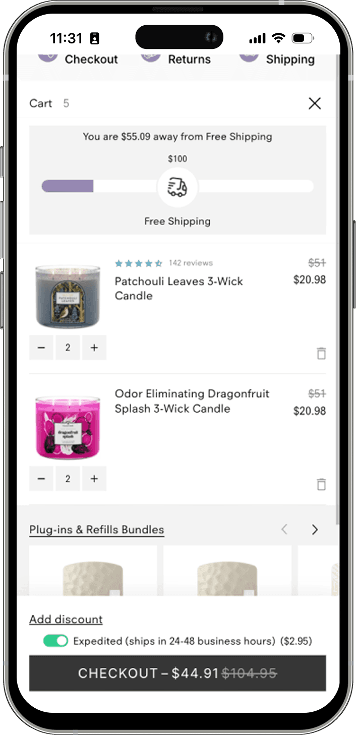 Showing fewer cart items by default made the cross-sell widget more visible. This helped increase AOV and checkout starts by reducing distraction and clutter.
