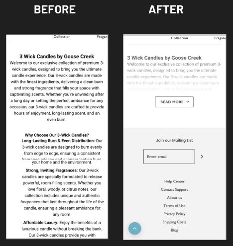 Collapse long secondary text blocks so important content isn’t pushed down the page. Keep all visible copy tightly focused on core benefits, trust signals, and outcomes the user will experience.