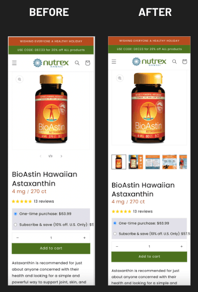 Add visuals highlighting UGC and social-proof to the gallery as well. Short customer videos and photo reviews dramatically increase trust and make the product feel more real and lower-risk to buy.