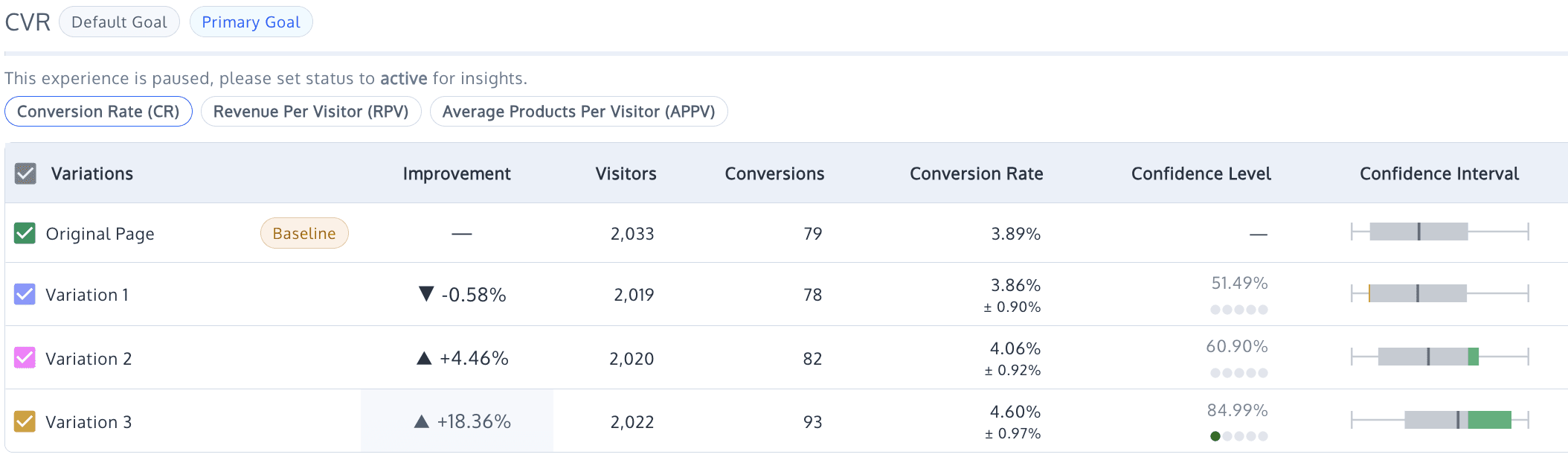 Variation 3 decreased conversion rate by 15.91% and revenue per visitor by 6.92%.