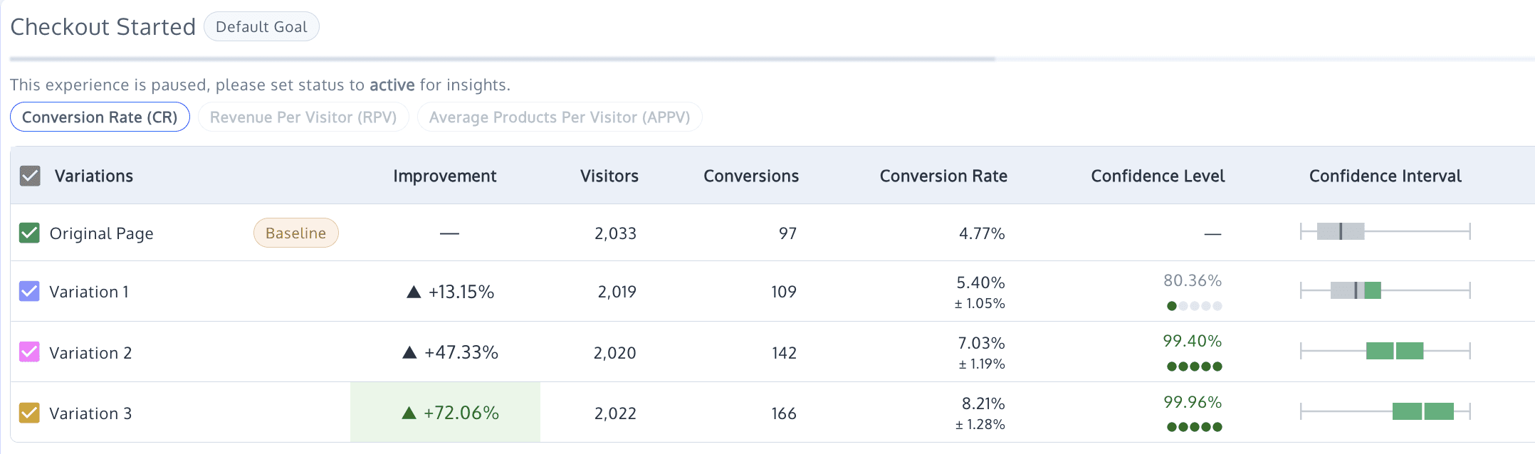 Variation 3 achieved an increased conversion rate of 18.36% and a 72.06% increase in Checkout Started.